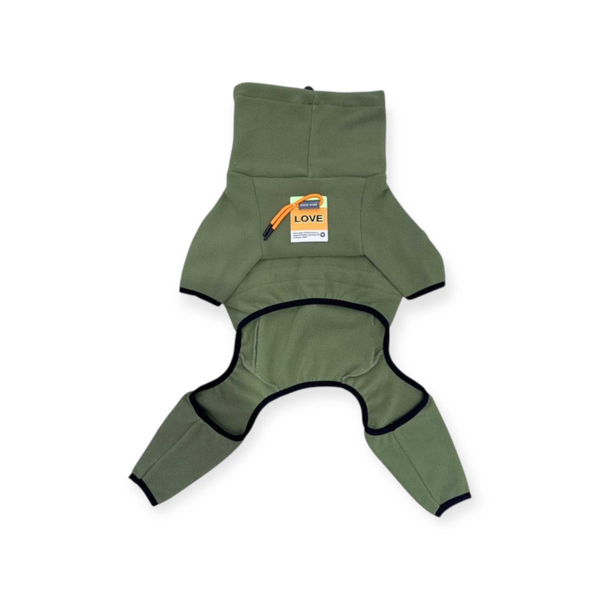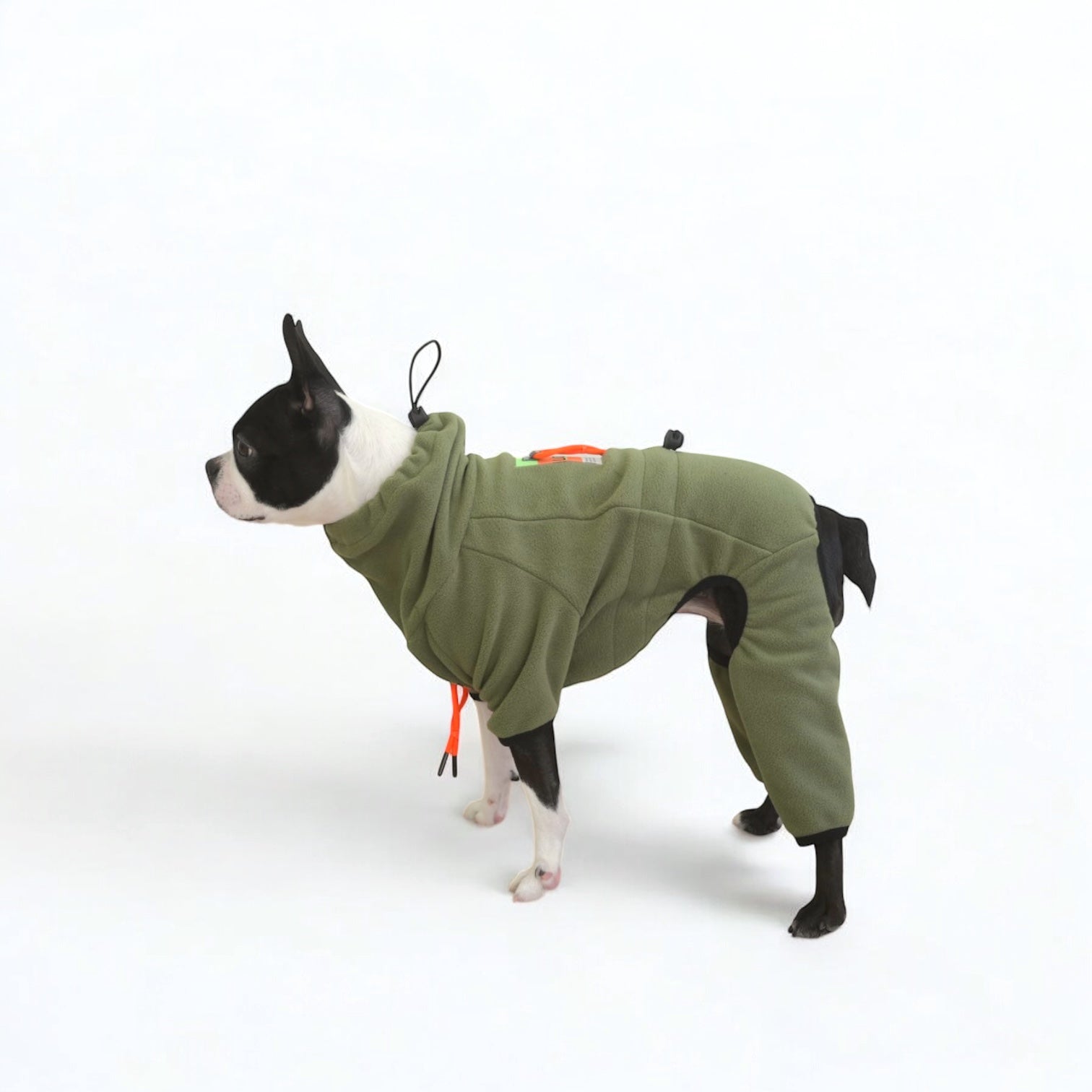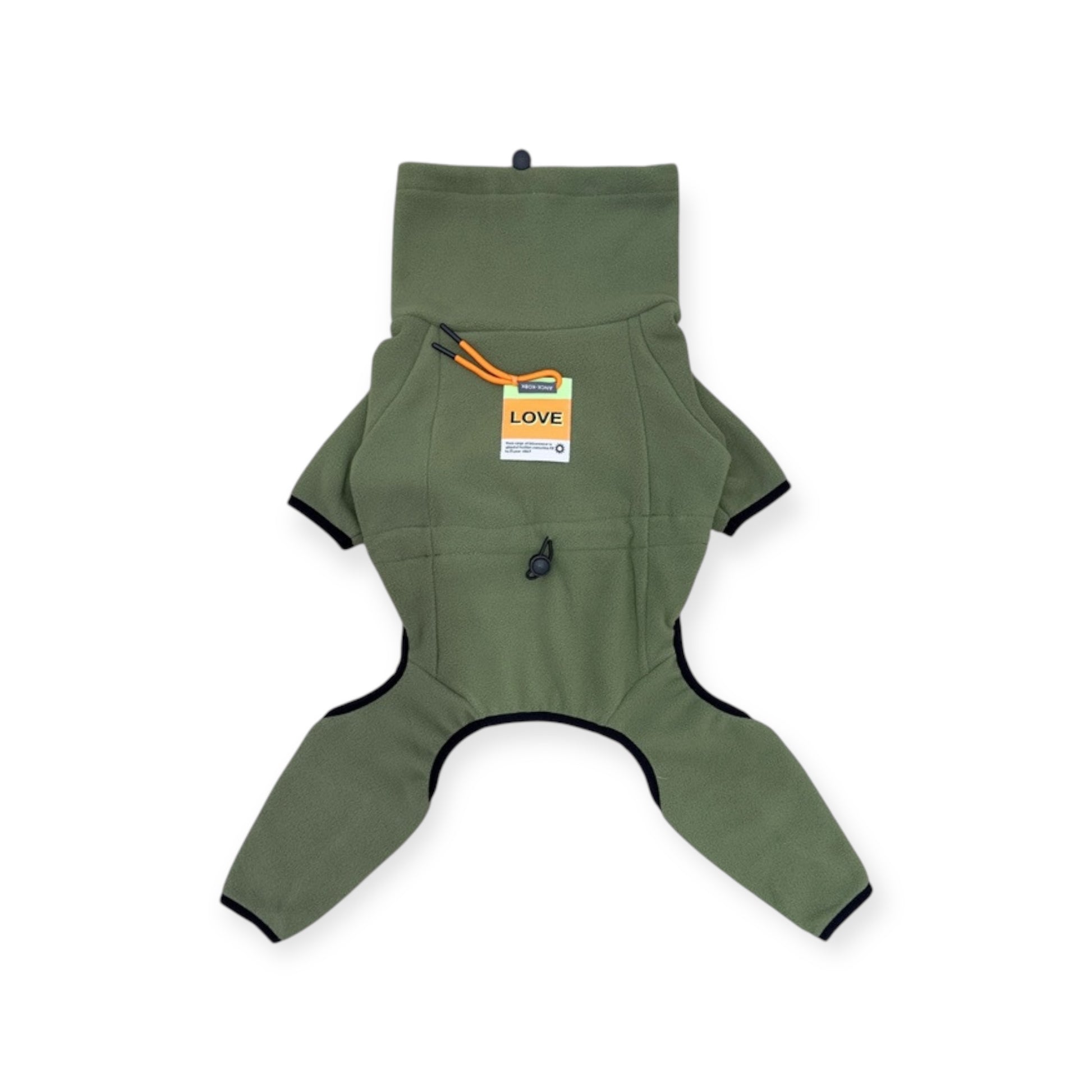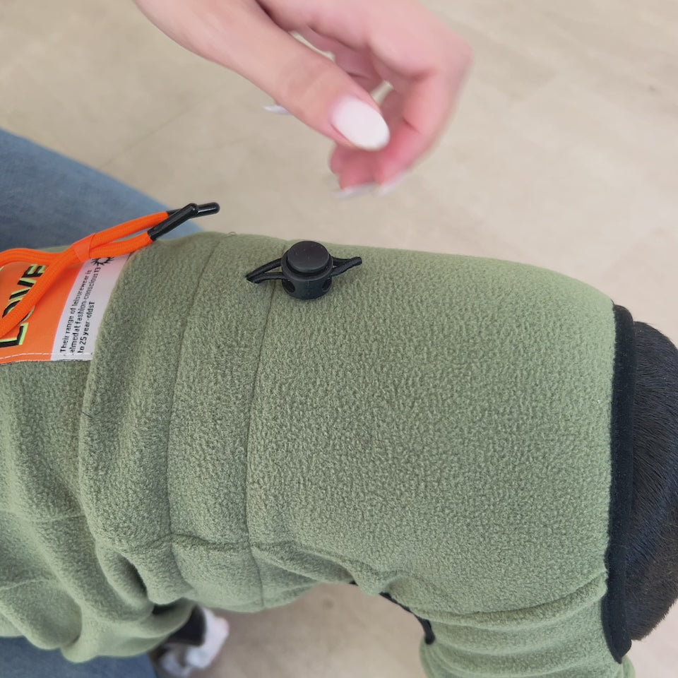 アーミーグリーン色のフリース生地のロンパース。首元には調整できる紐が付いており、しっかりホールドできるので保温性抜群です。胴回りを調整できる紐が付いているのでサイズの微調整可能です。