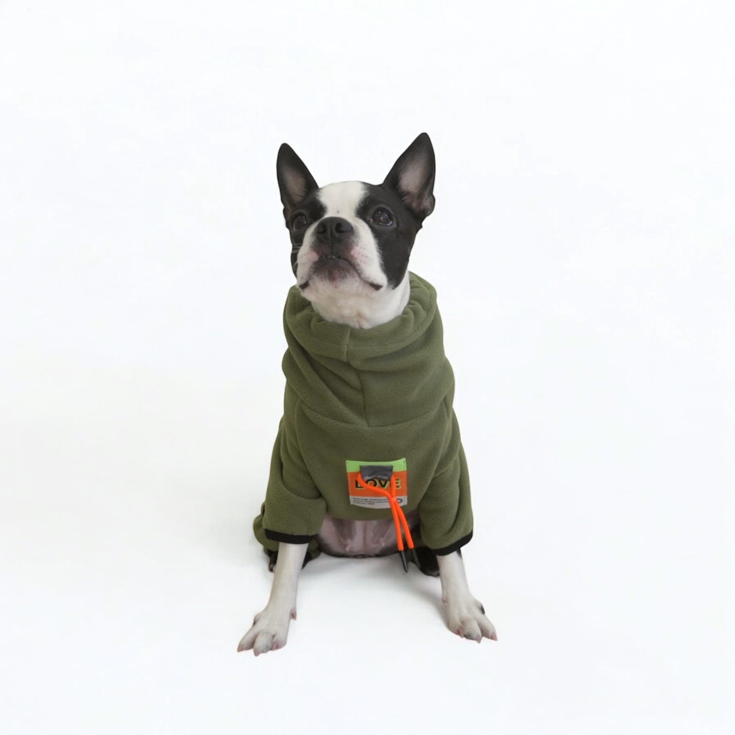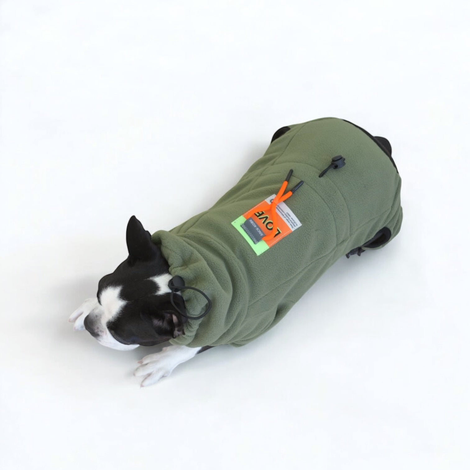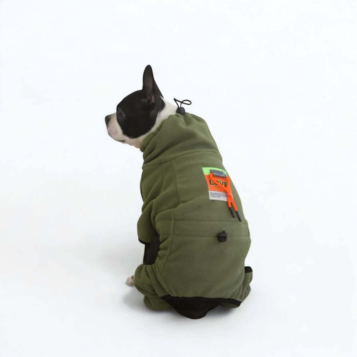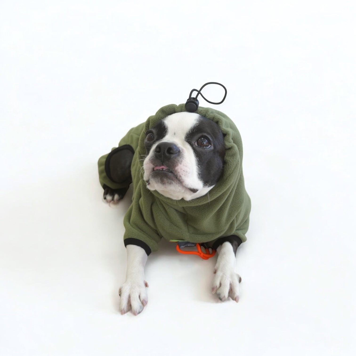 アーミーグリーン色のフリース生地のロンパース。首元には調整できる紐が付いており、しっかりホールドできるので保温性抜群です。胴回りを調整できる紐が付いているのでサイズの微調整可能です。