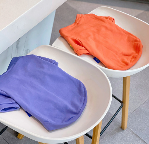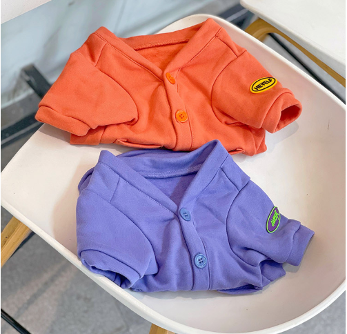 鮮やかなオレンジとパープルの2色展開。軽量で首周りが大きい子にも着用しやすい前開きカーディガンになります。