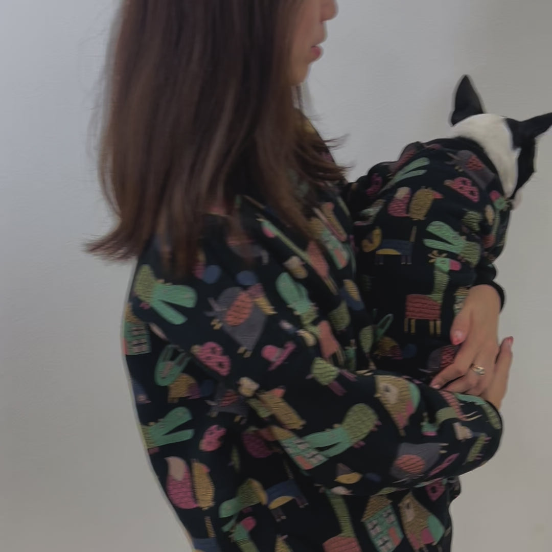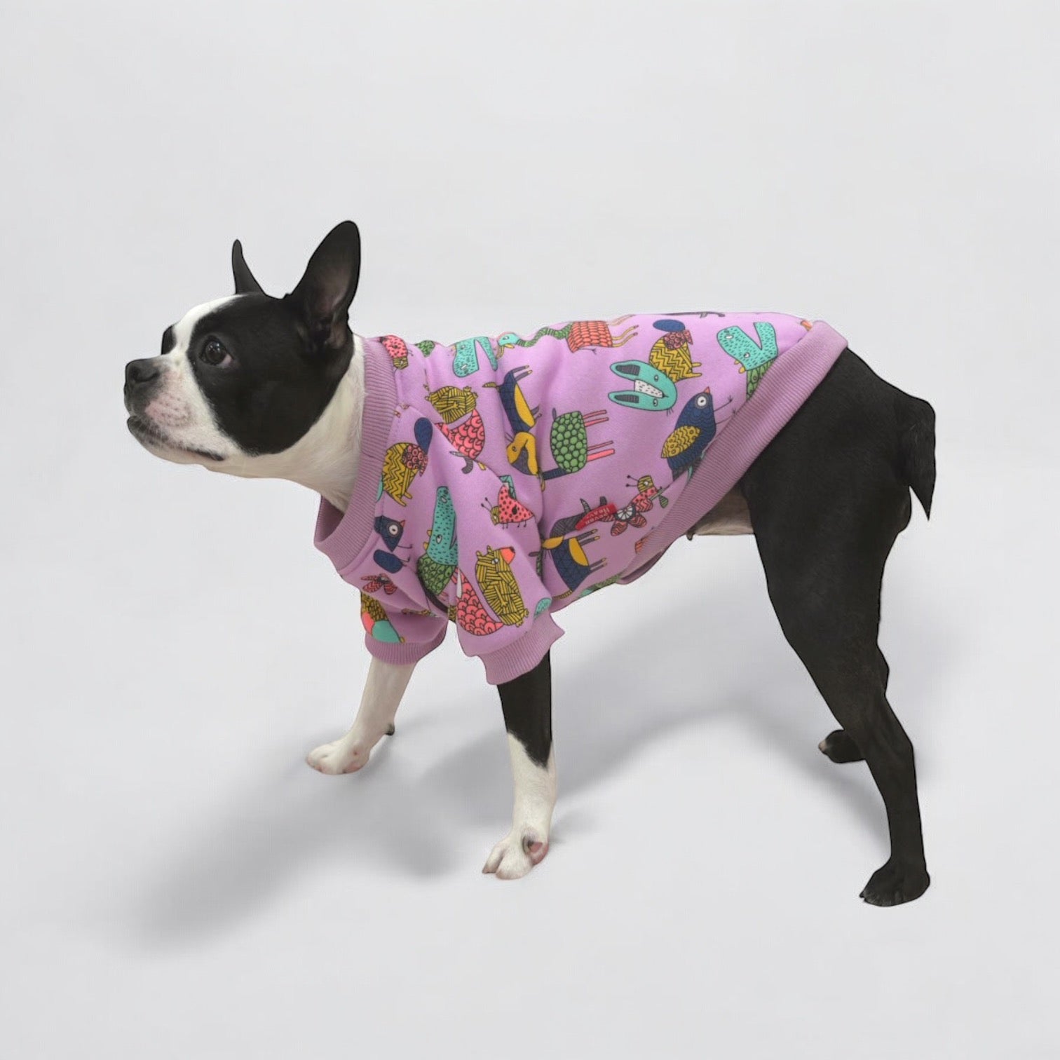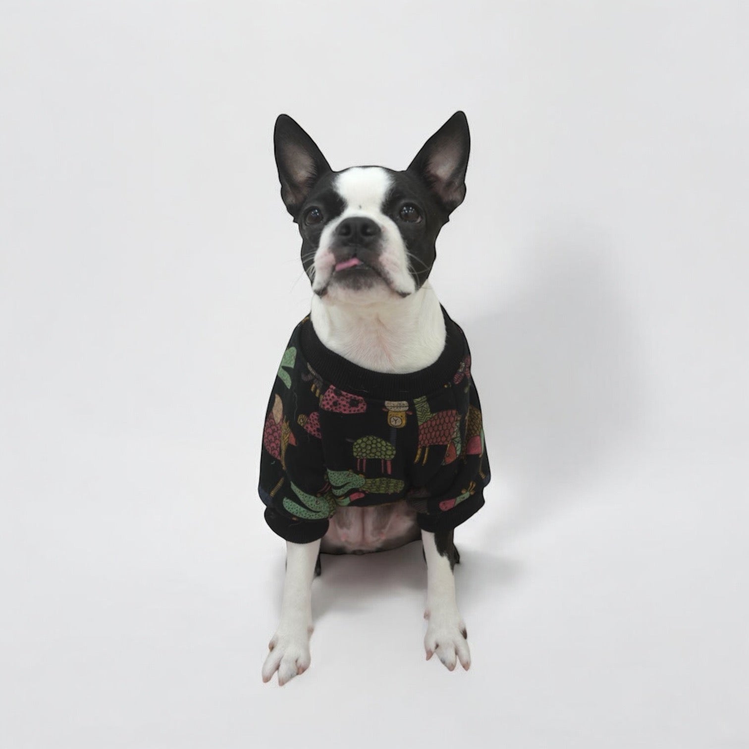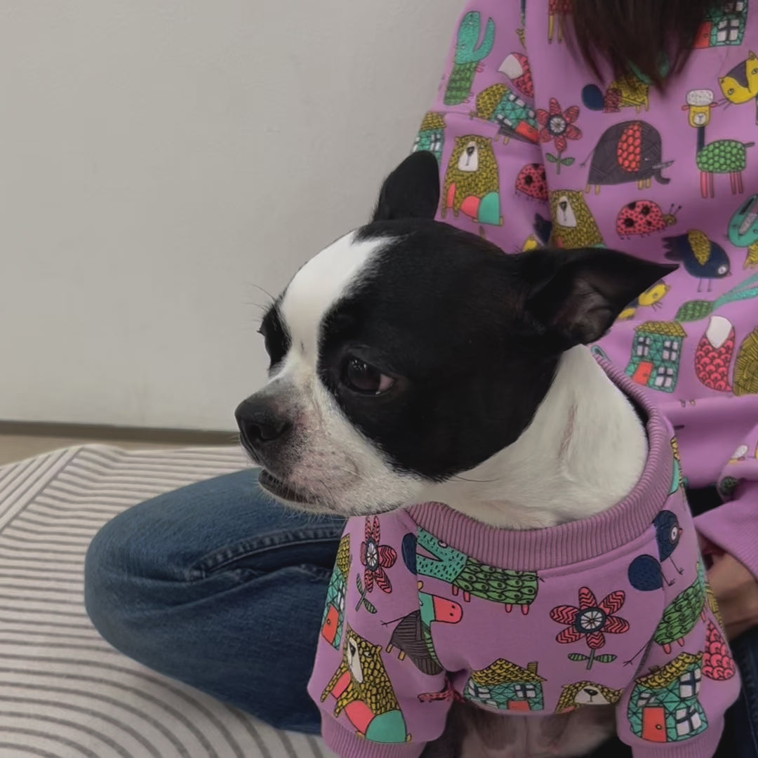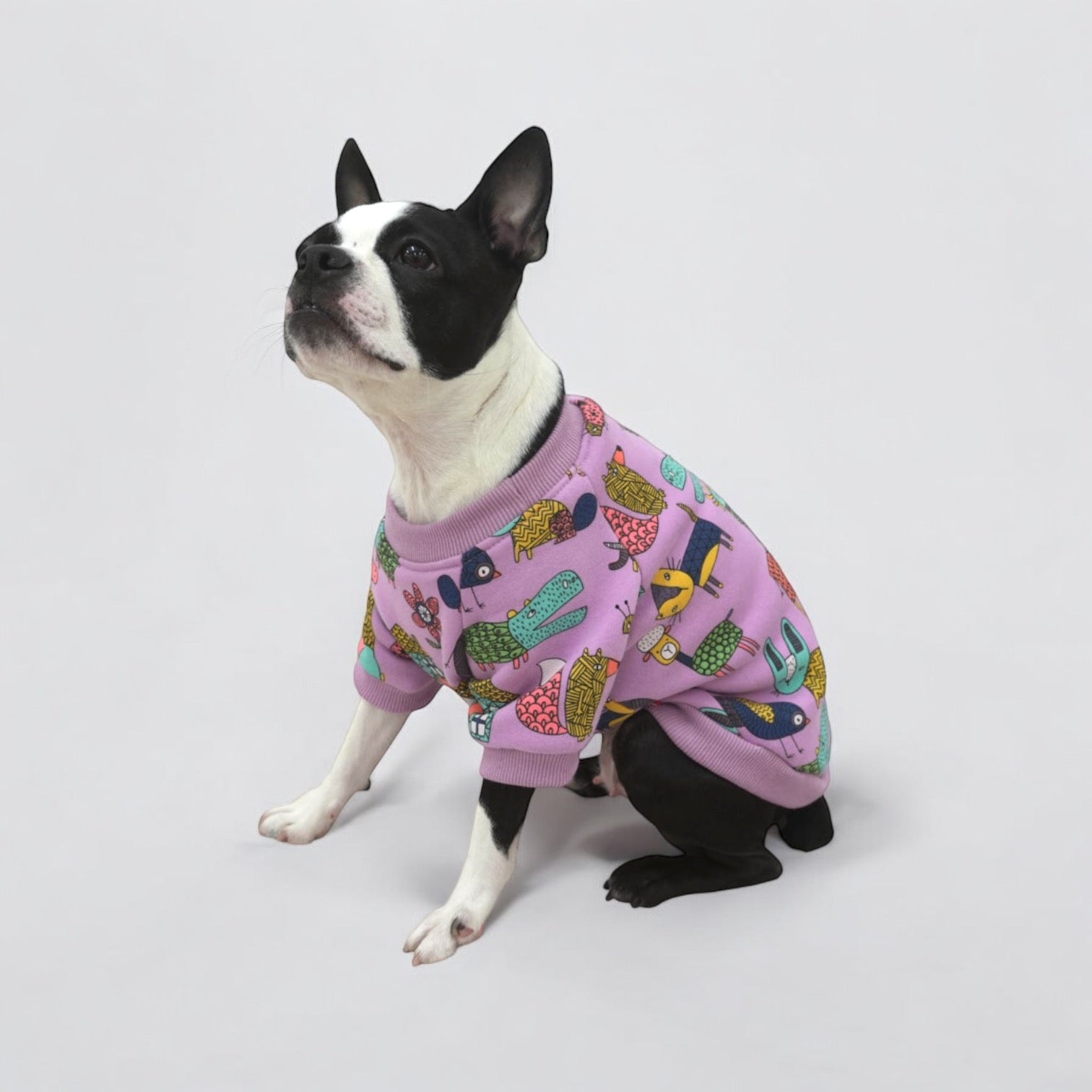 カラフルなアニマル柄のトレーナーになります。裏地が厚みのあるベルベット素材なので冬でも暖かく着こなせます。