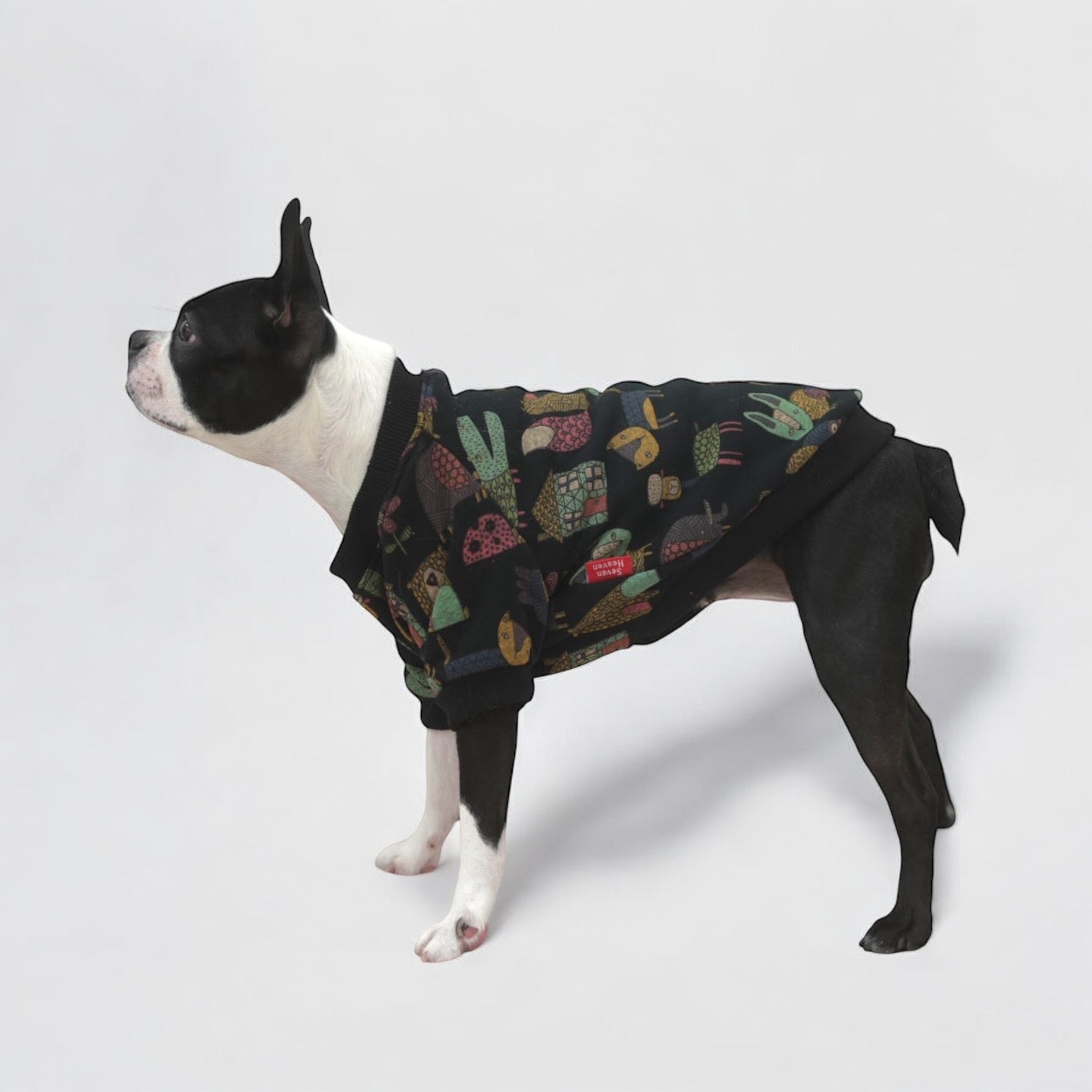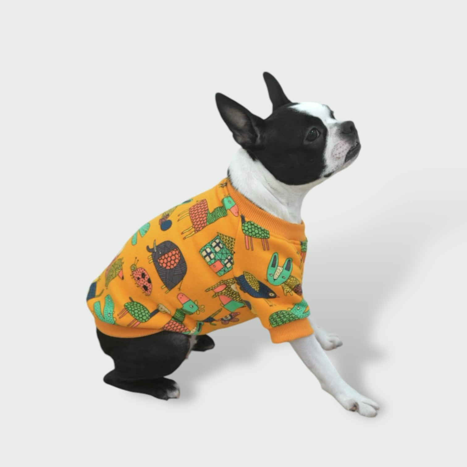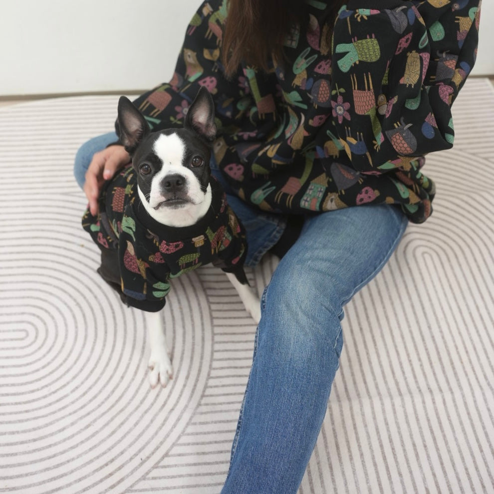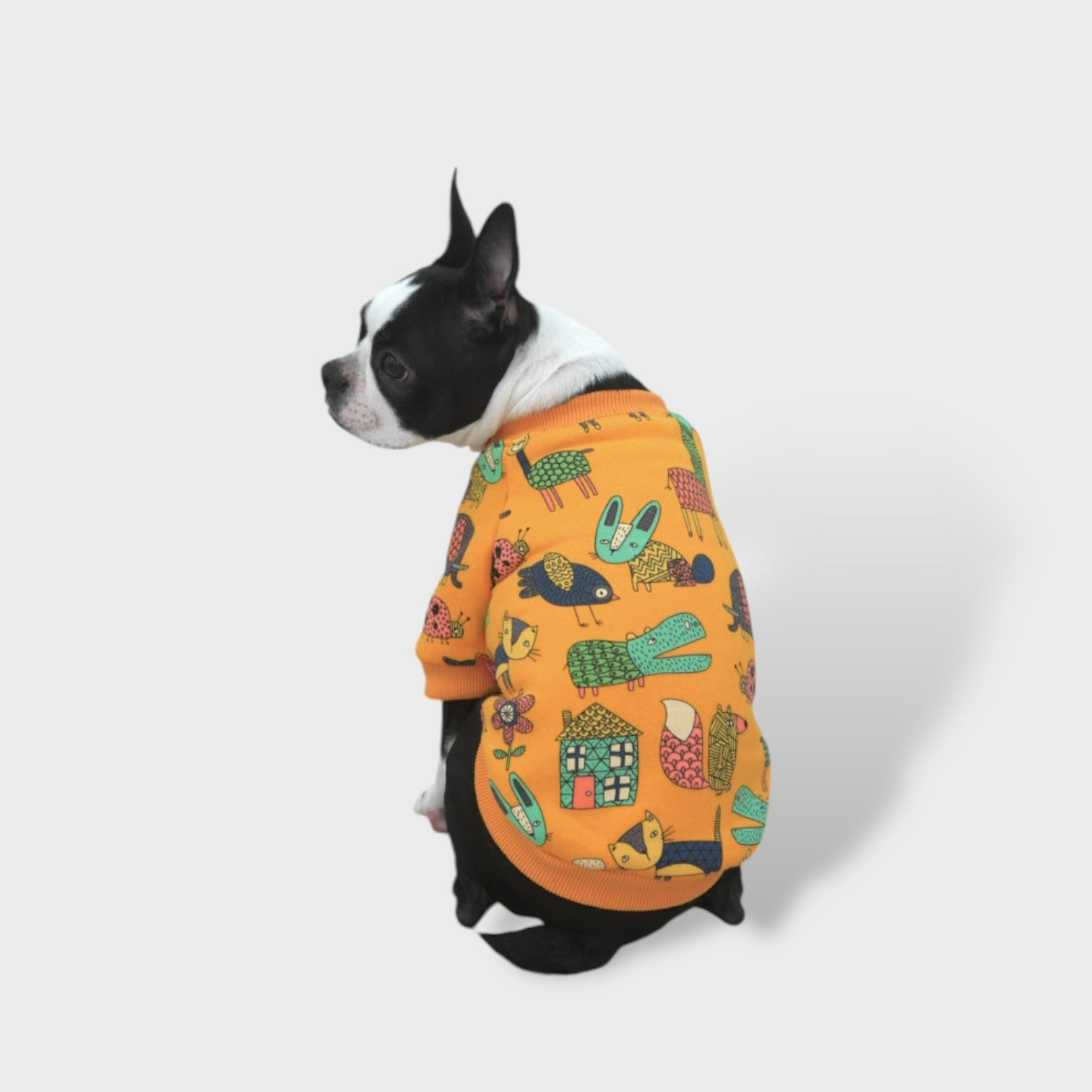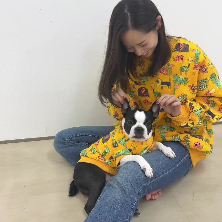 カラフルなアニマル柄のトレーナーになります。裏地が厚みのあるベルベット素材なので冬でも暖かく着こなせます。