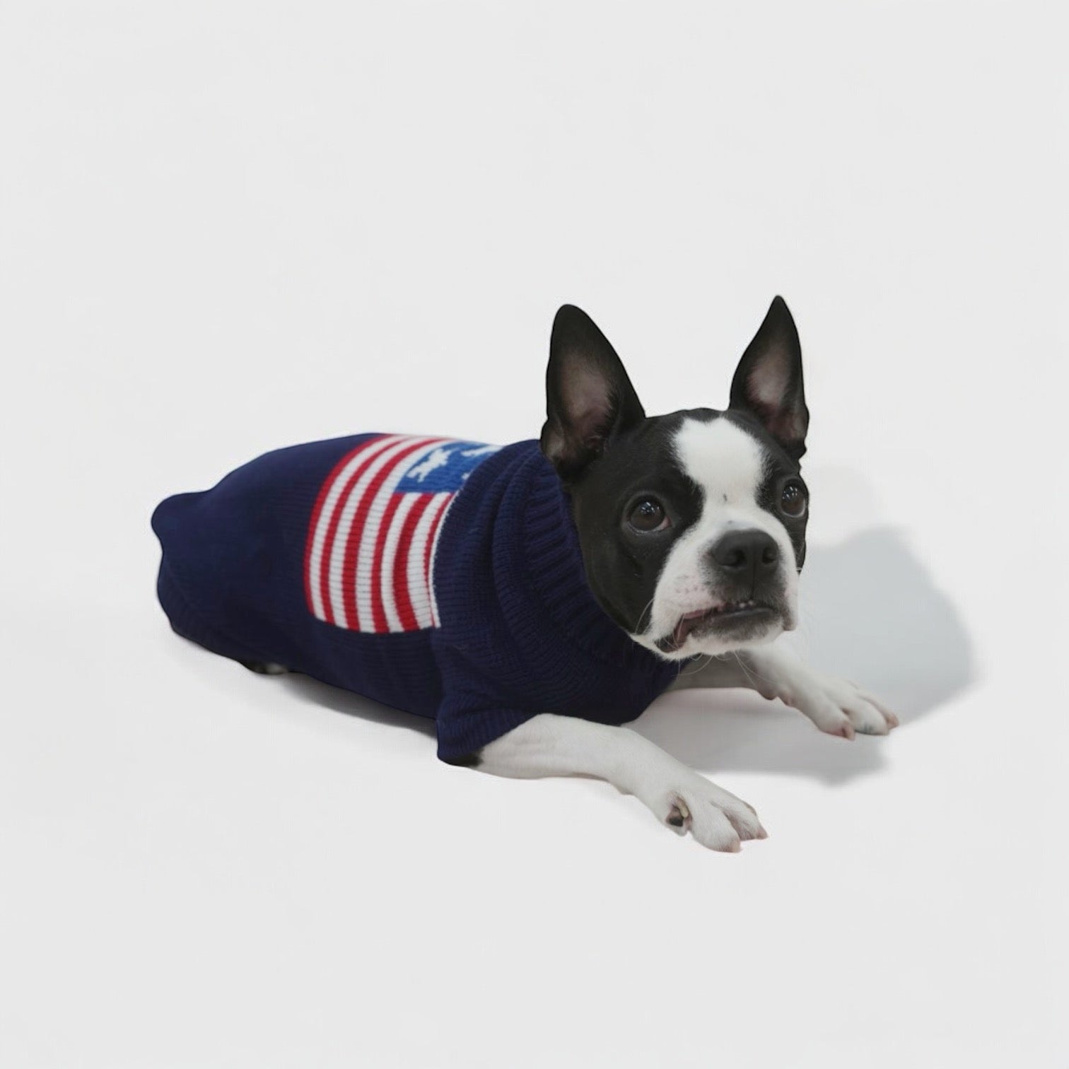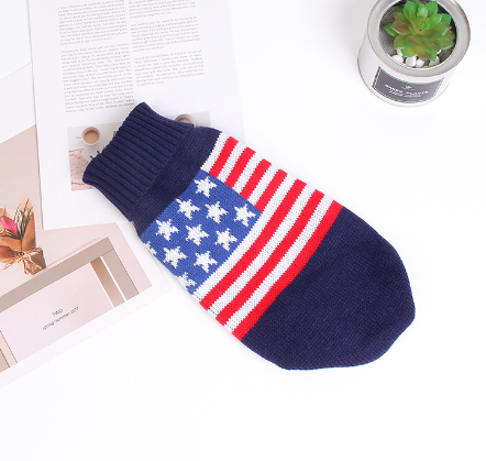 アメリカ国旗が背中に印字されたニットとなっております。首元までしっかり覆れるハイネックデザインなので冬も暖かくご着用いただけます。