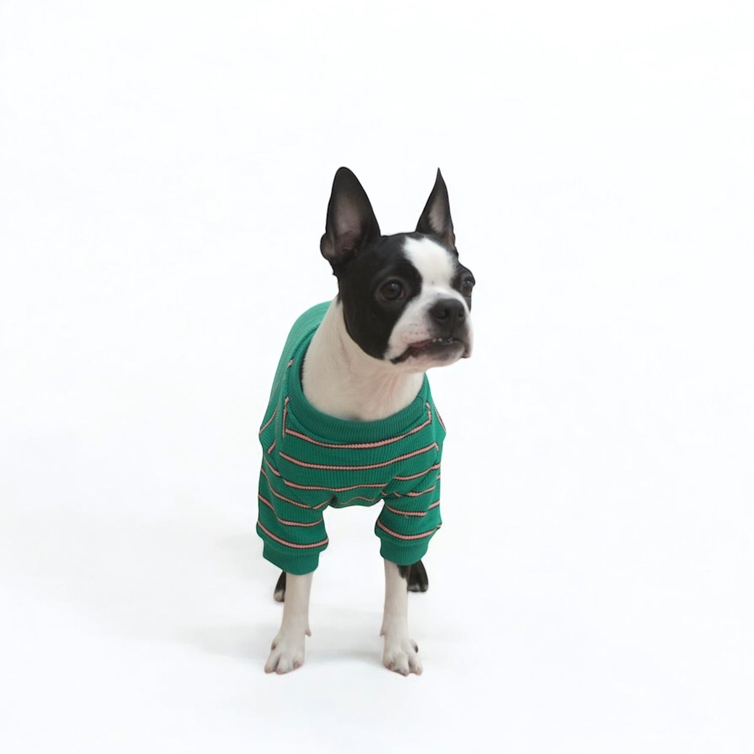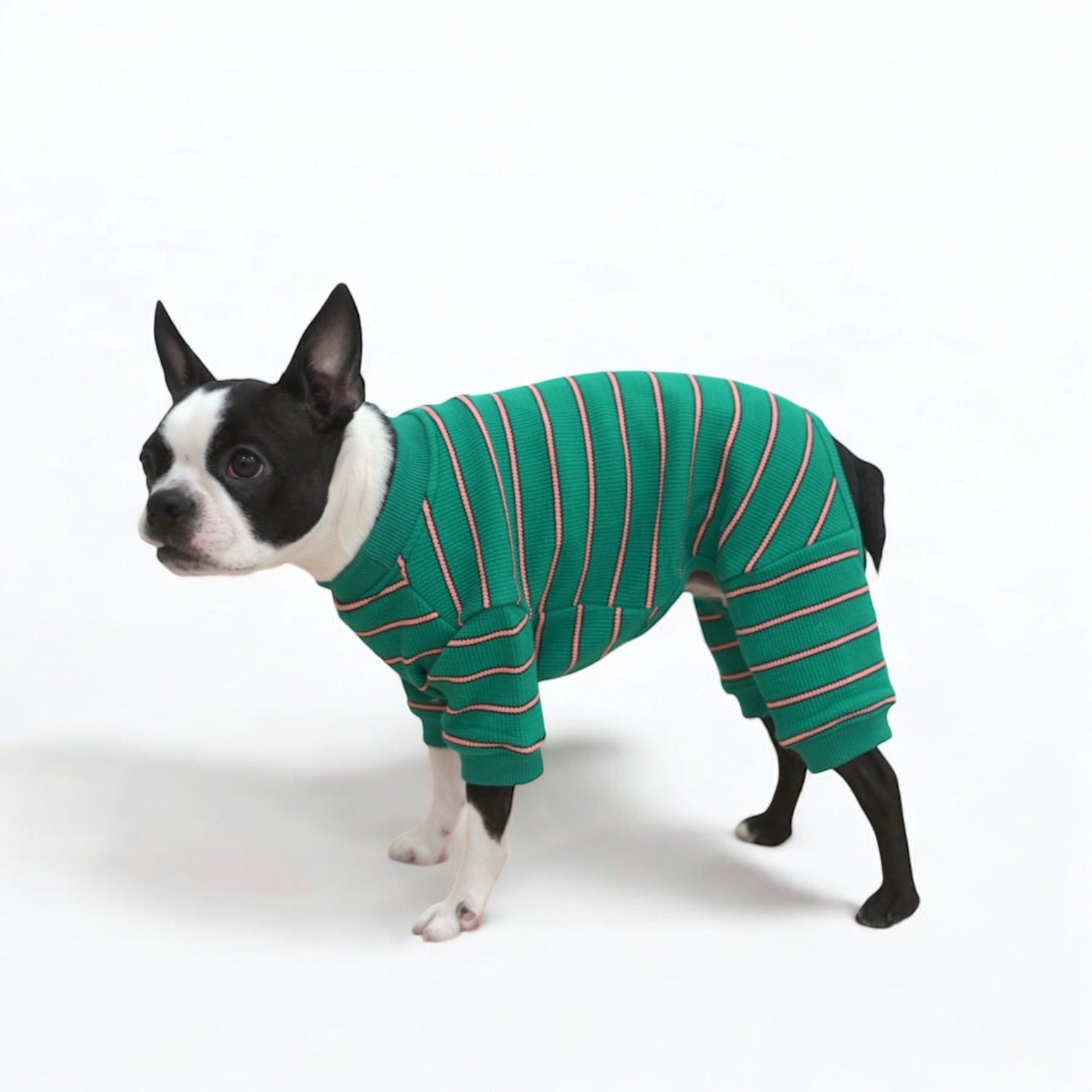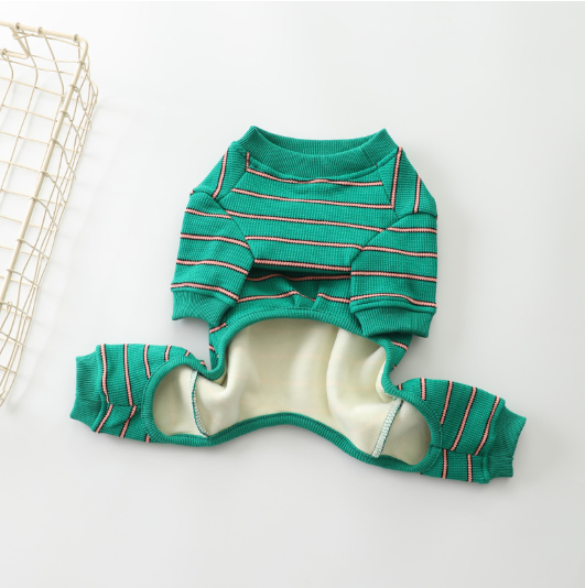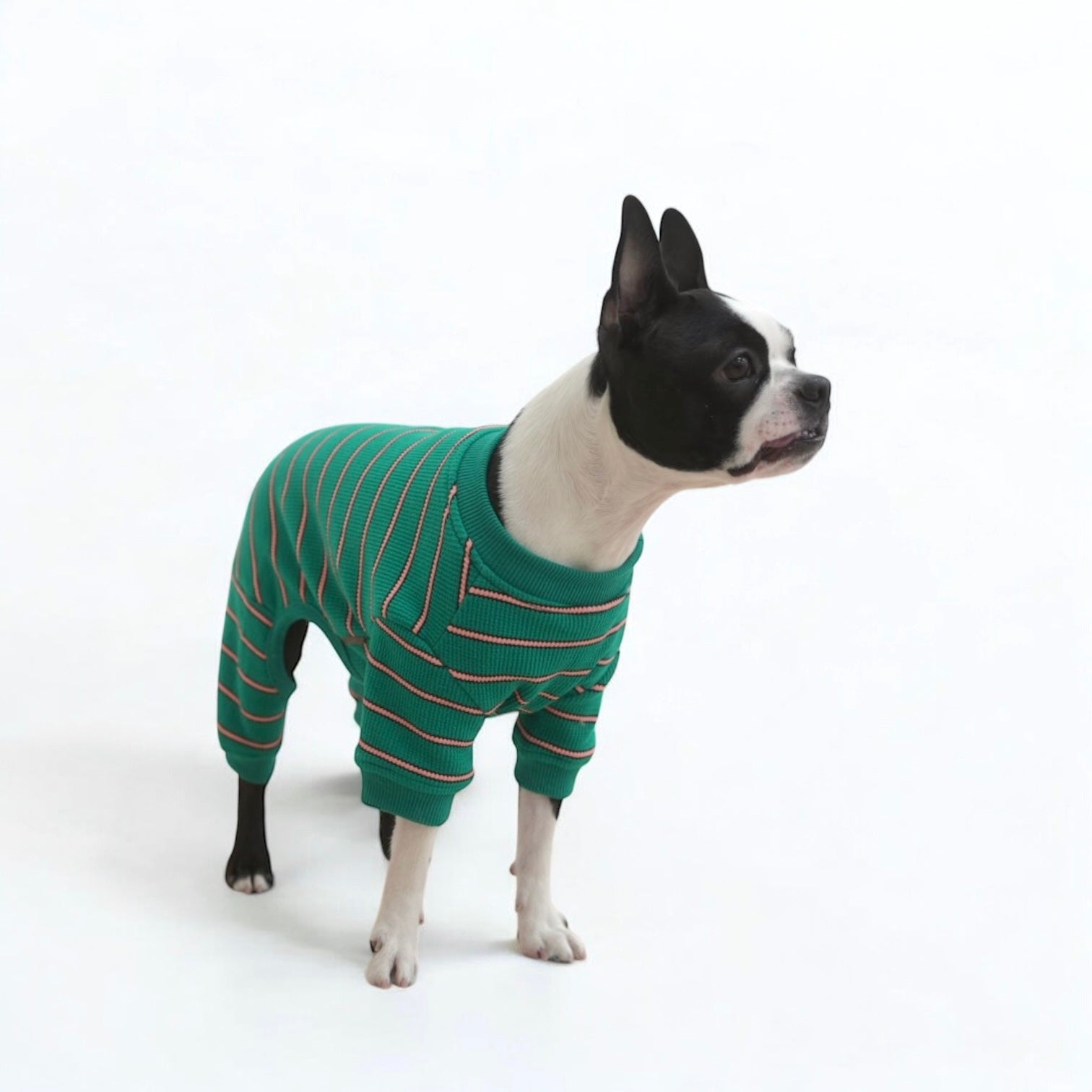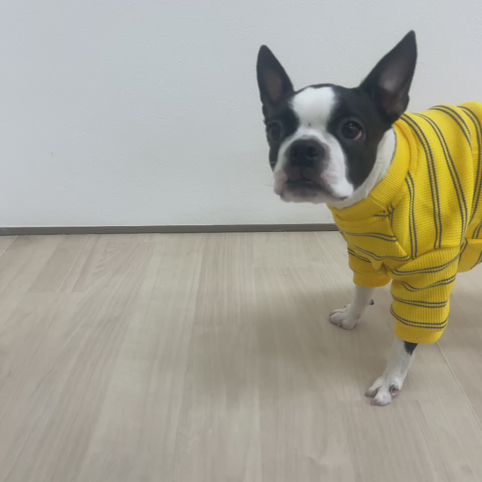 裏起毛で保温性のあるマルチボーダー柄のロンパース。イエローとグリーンの2色展開になります。