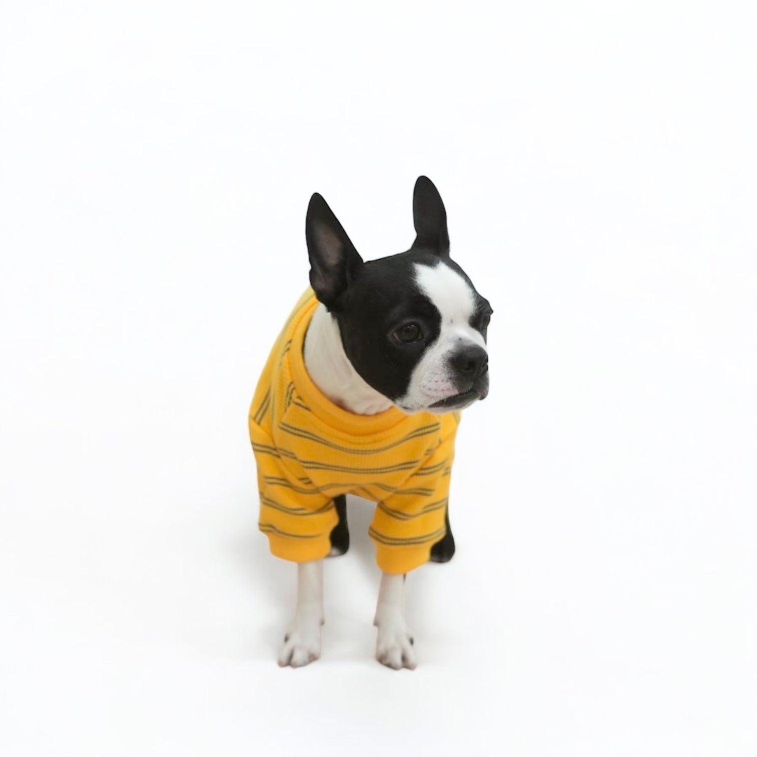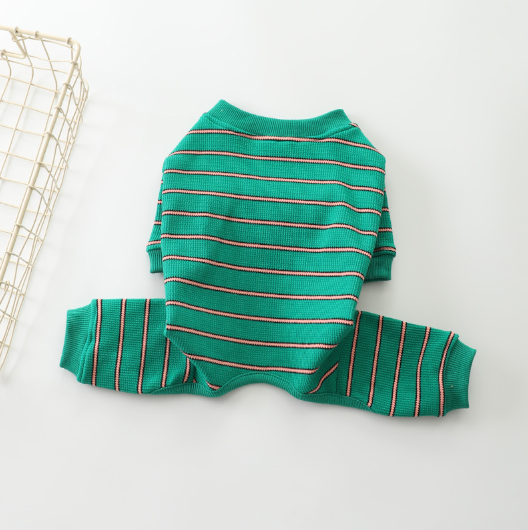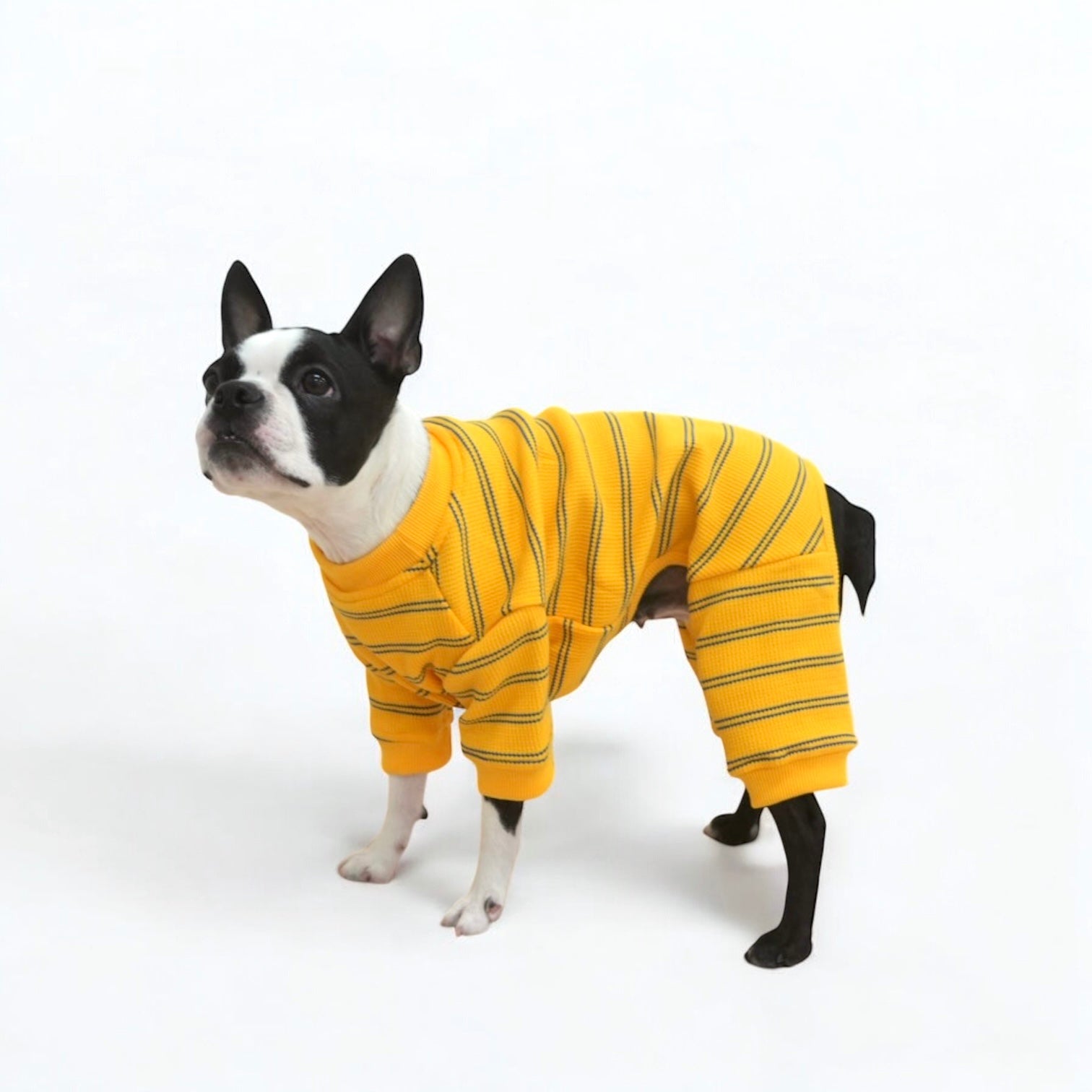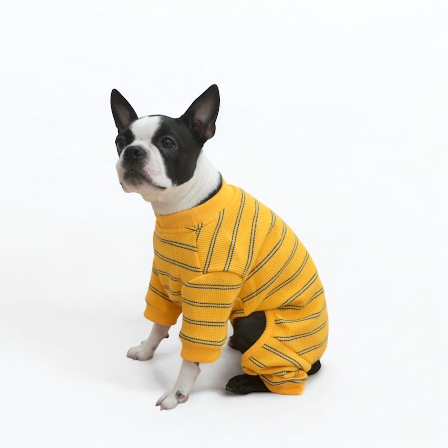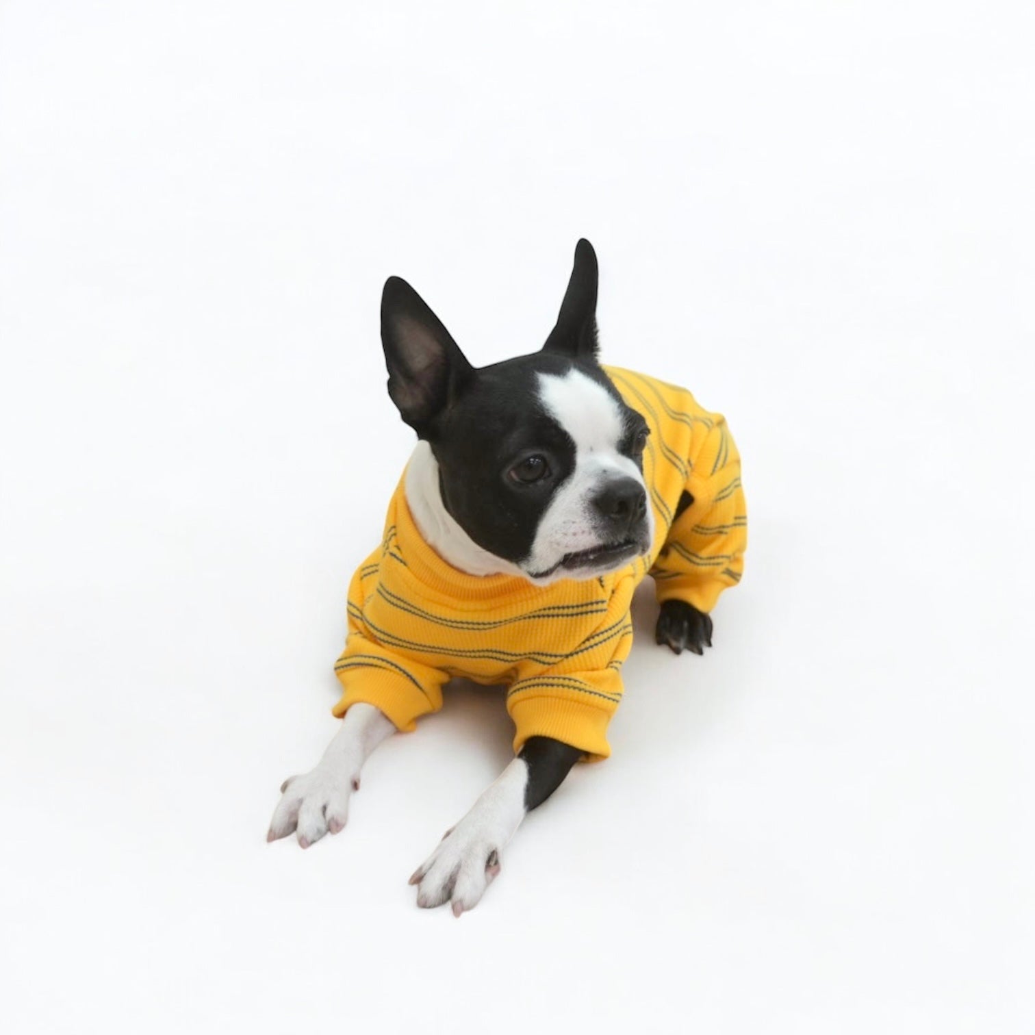 裏起毛で保温性のあるマルチボーダー柄のロンパース。イエローとグリーンの2色展開になります。