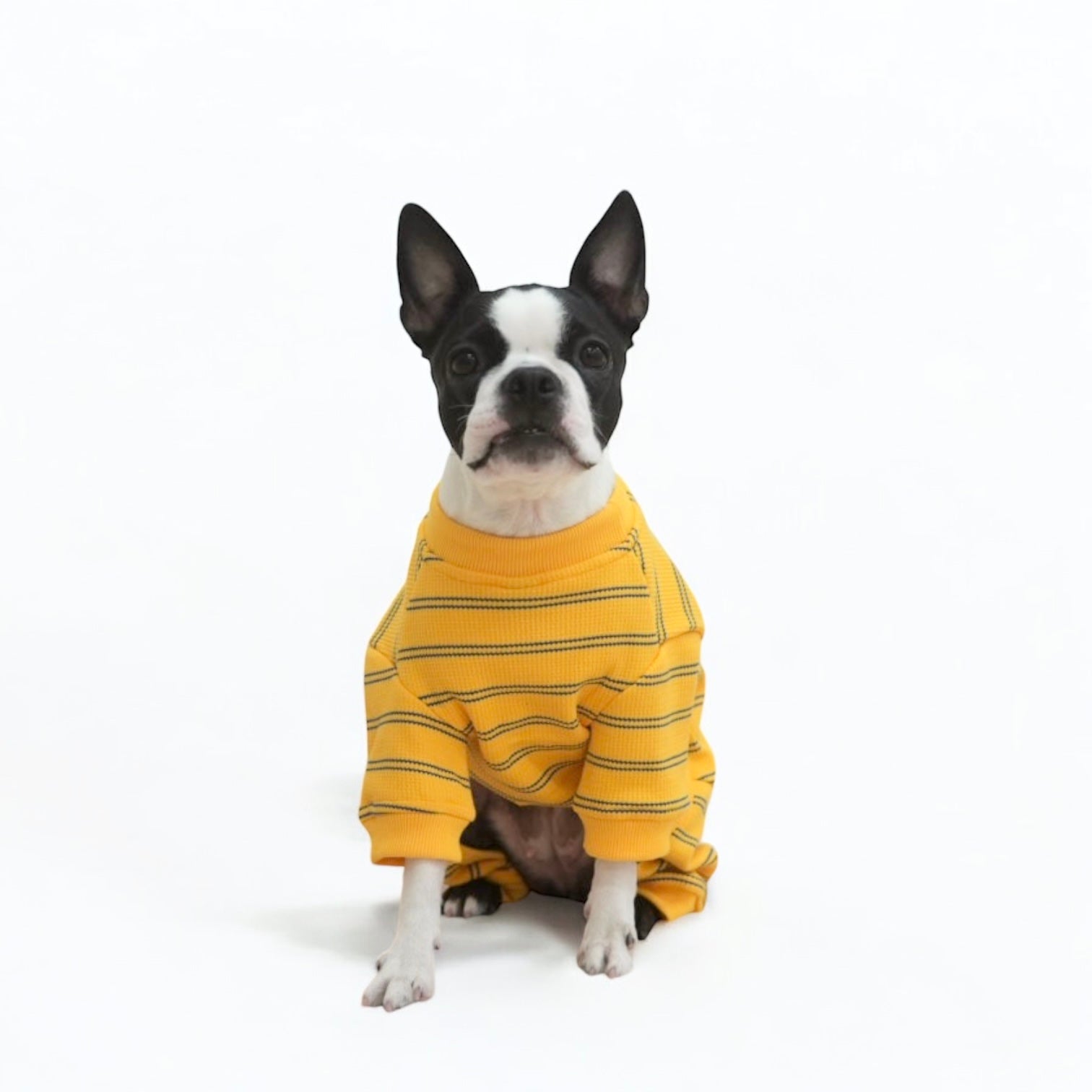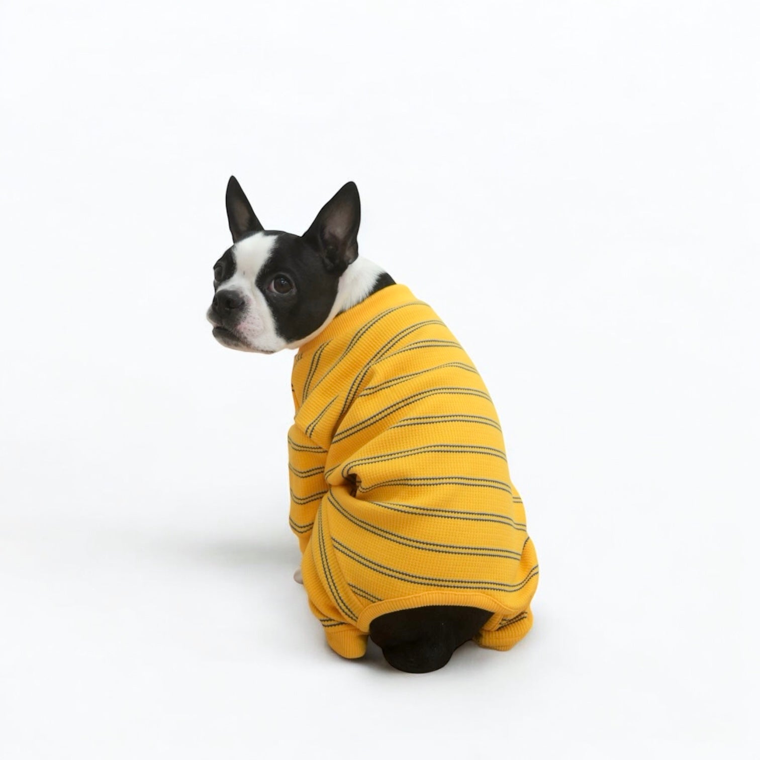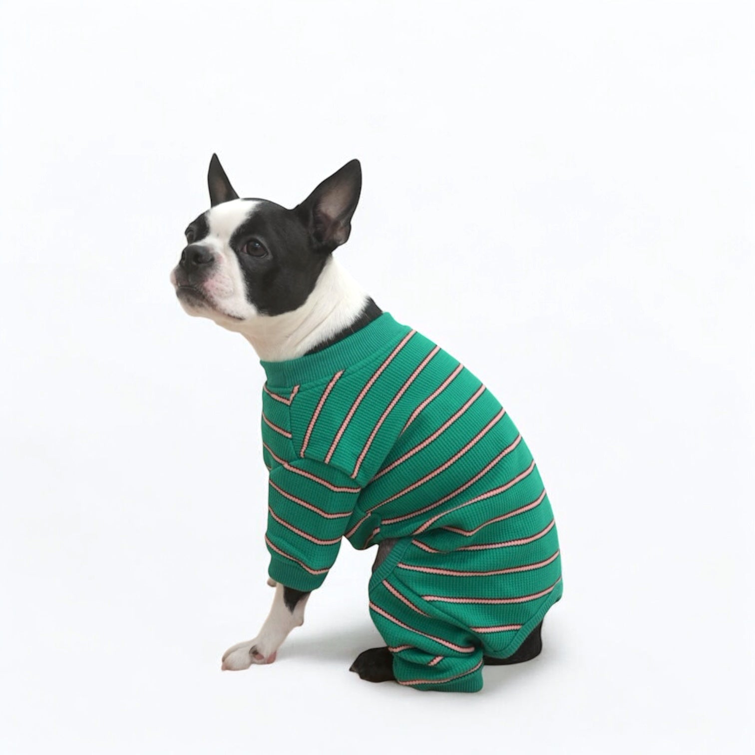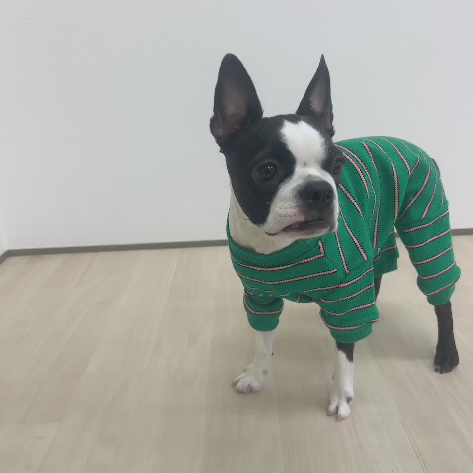 裏起毛で保温性のあるマルチボーダー柄のロンパース。イエローとグリーンの2色展開になります。